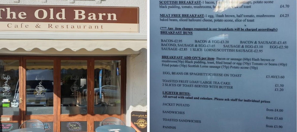 A toasted teacake combined with a brew and a chat. The owner was very pleasant and accommodating. The Old Barn offers excellent food and craft items for sale with good service and value for money, set in a cosy clean environment. Would highly recommend.